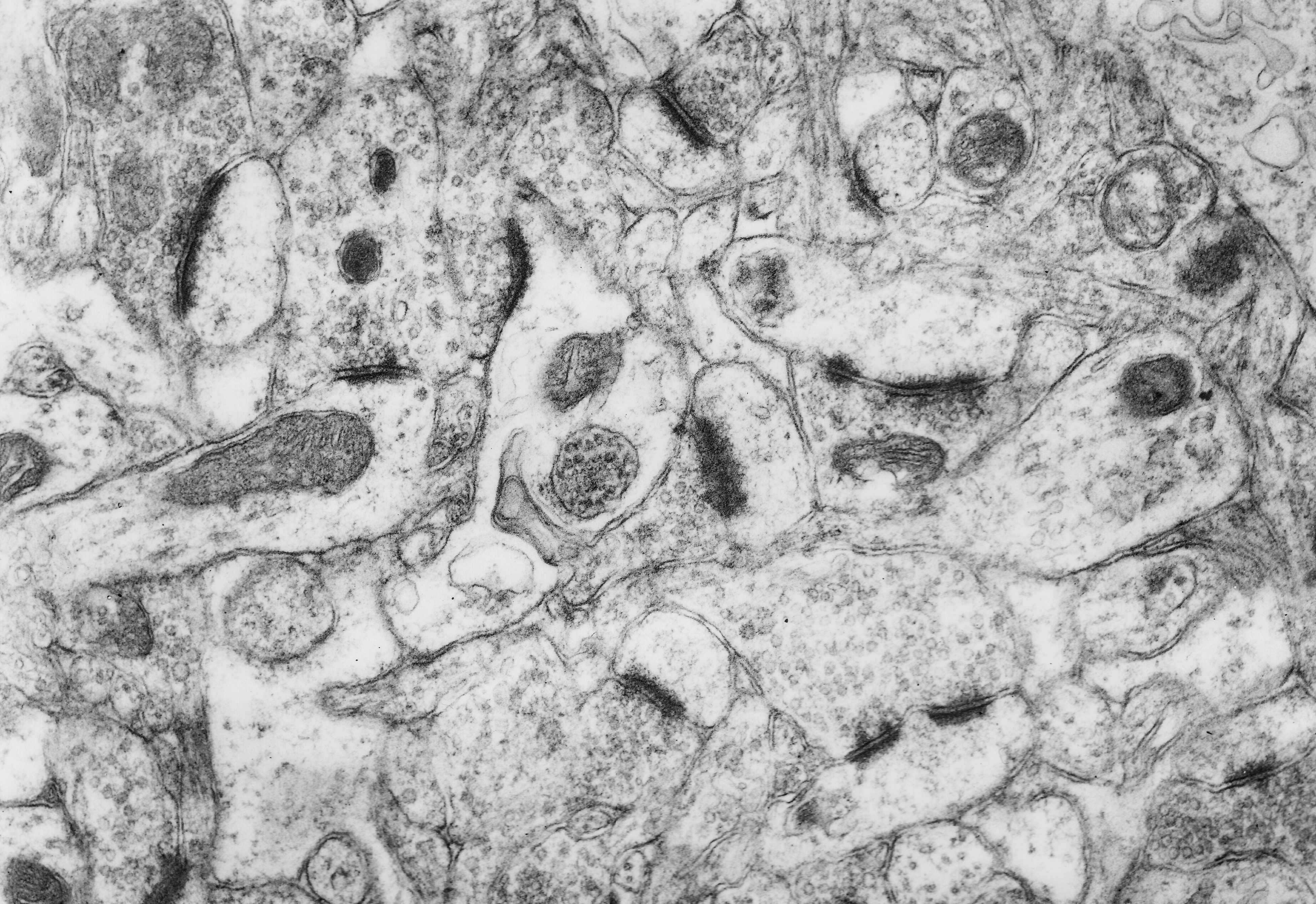 Fig. 1.6.01. The darkly stained postsynaptic densities of synapses are in contrast with all other, much lighter structures. Densities appearing to be doubled (asterisks), are in fact, when three-dimensionally reconstructed, parts of one fenestrated (perforated) density. Scale = 1 µm. (Mouse, neocortex.) Download the high resolution image.