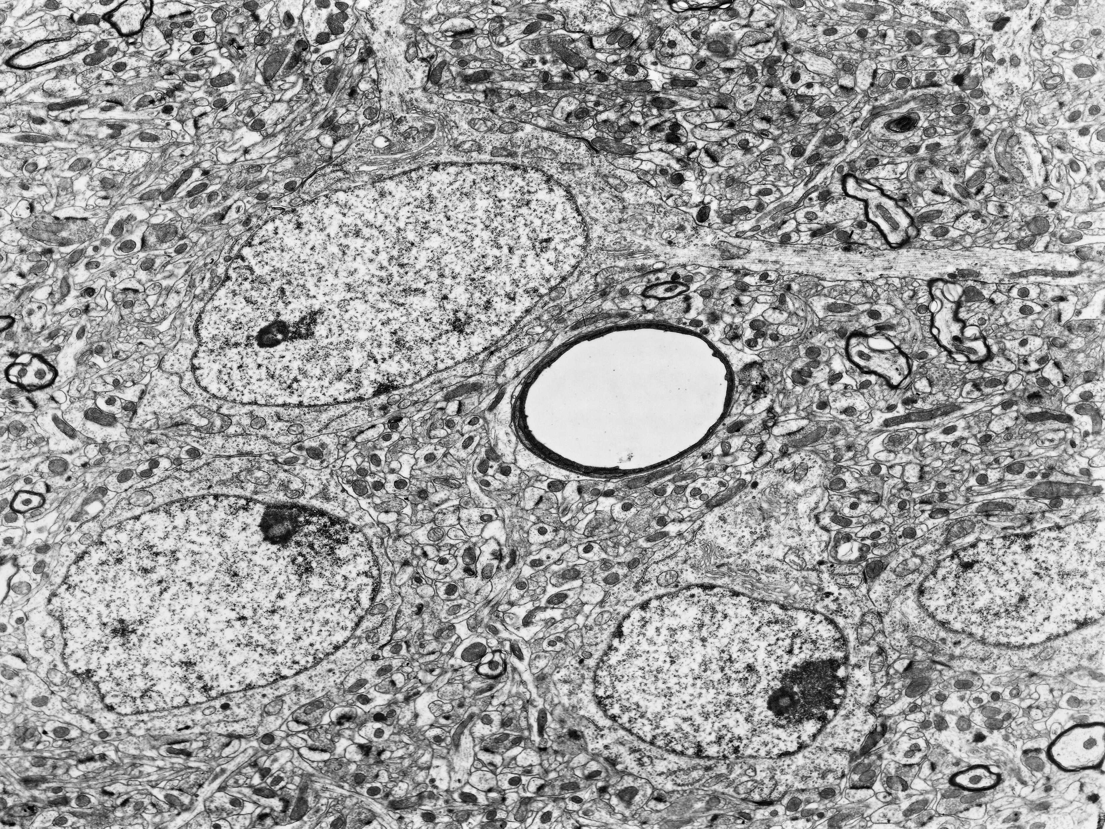 Fig. 1.9.01. The neuropil characteristic of neocortex between pyramidal cells (P). C - lumen of a blood capillary. Scale = 5 µm. (Mouse, neocortex.) Download the high resolution image.