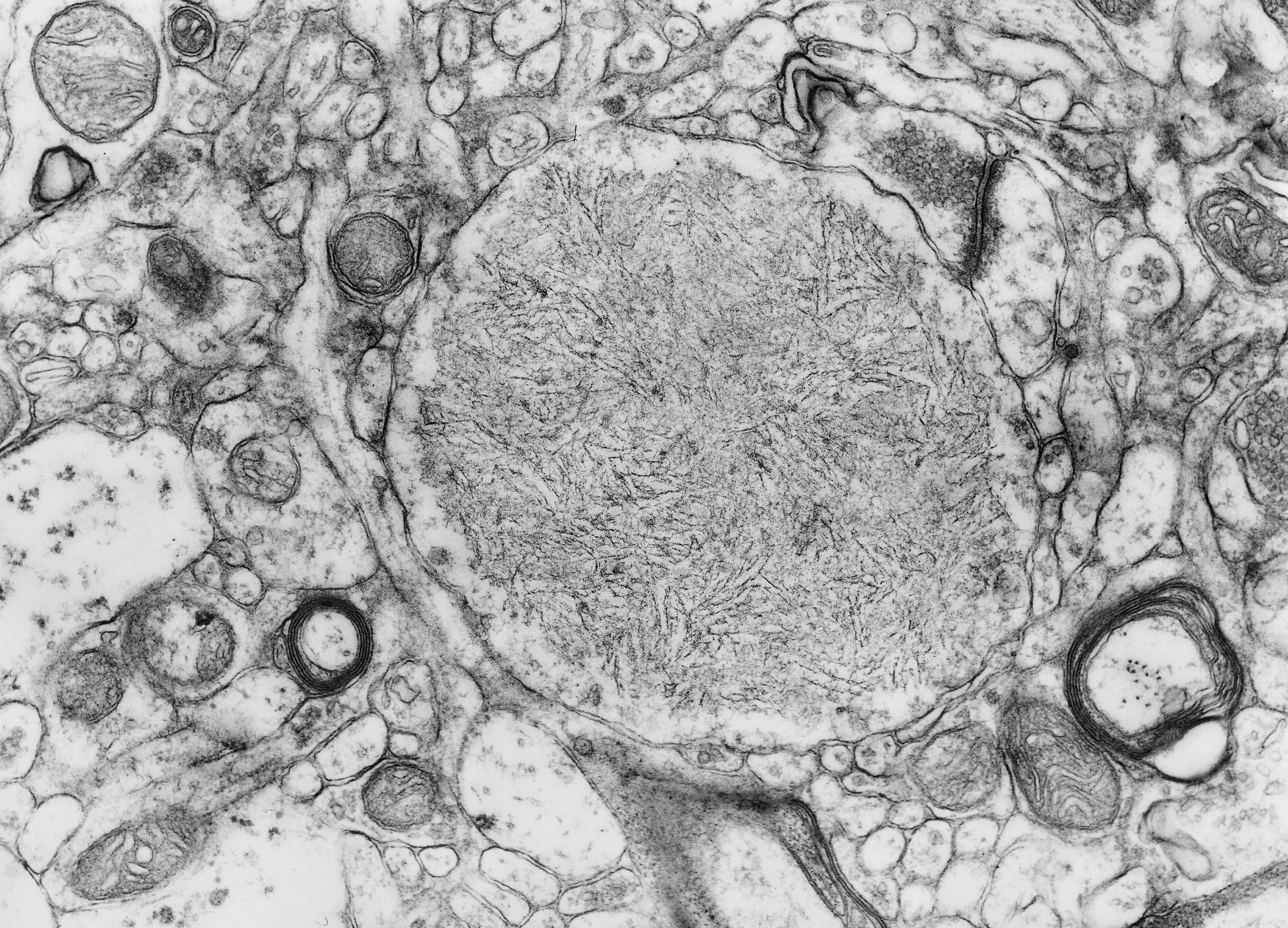 Fig. 7.2.3.01. Corpus amylaceum, a result of degeneration of astrocyte process (asterisk), frequently found in older brains. Scale = 1 µm. (Human, neocortex.) Download the high resolution image.